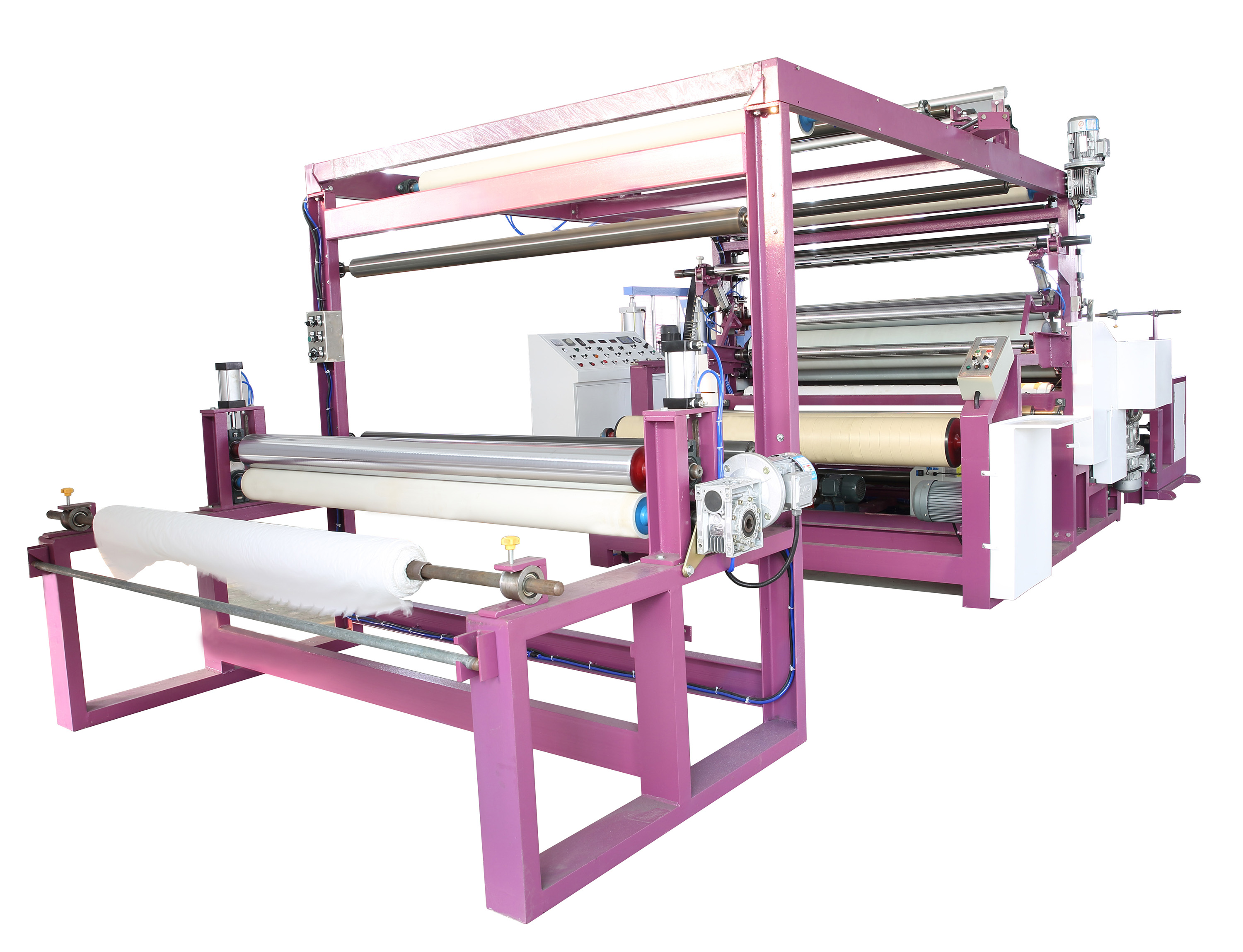 PUR熱熔膠復合機是一種把不需溶劑、不含水份、100%的固體可熔性的聚合物,在常溫下為固體,加熱熔融到一定程度變為能流動且有一定粘性的液體粘合劑,把PUR熱熔膠涂布在基材上面,然后把另一種基材和涂膠的基材復合在一起的設備。